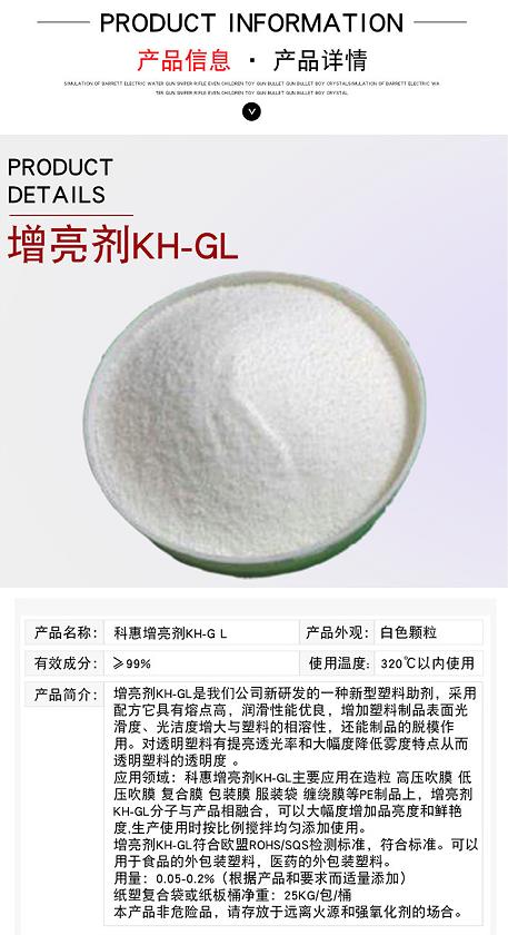 增亮劑KH-GL是我們公司新研發(fā)的一種新型塑料助劑,采用先進技術(shù)配方它具有熔點高,潤滑性能優(yōu)良,增加塑料制品表面光滑度、光潔度增大與塑料的相溶性,還能提高制品的脫模作用和抗粘作用。對透明塑料有提亮透光率和大幅度降低霧度特點從而提高透明塑料的透明度